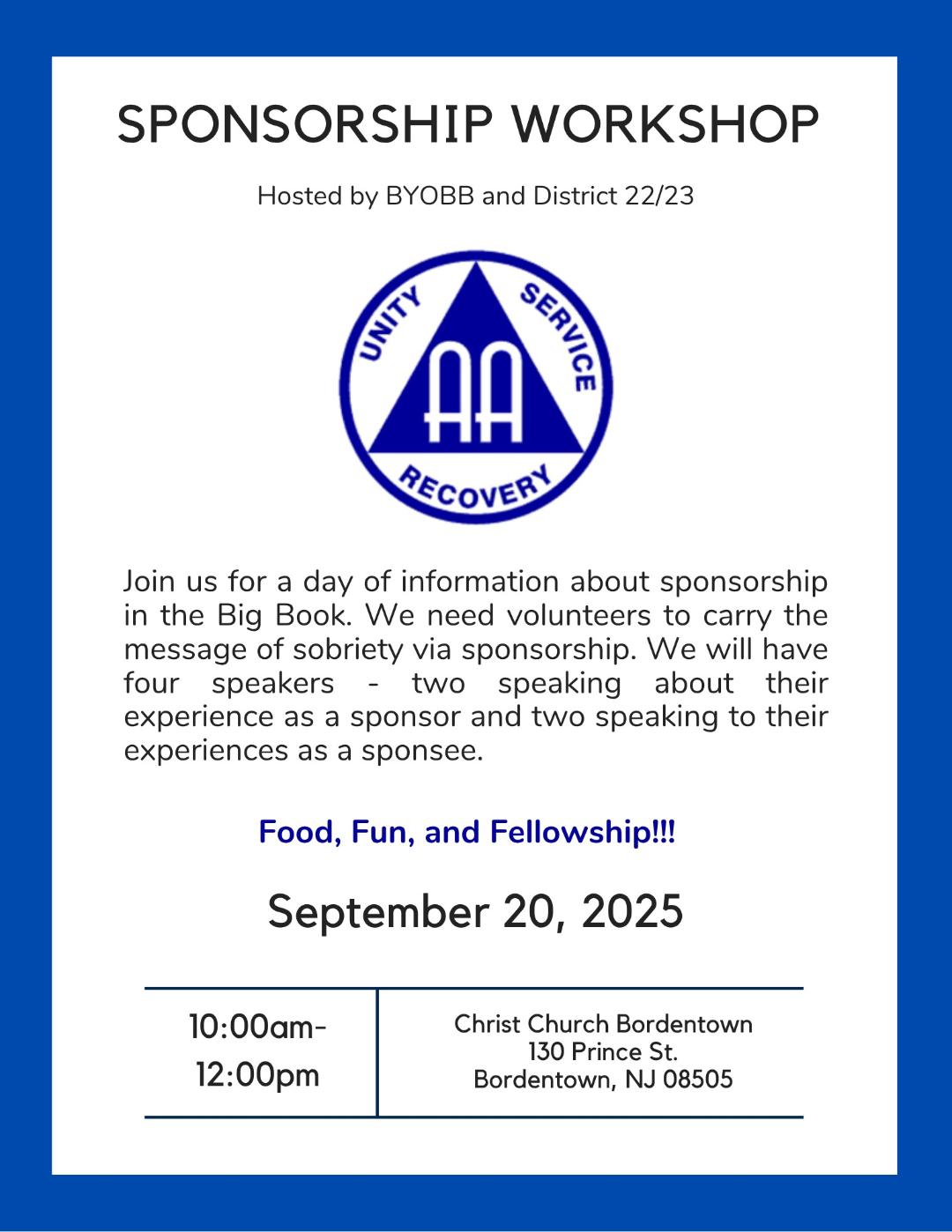 What do you know about A.A.'s Three Legacies of Recovery, Unity, and Service? Attend this FREE Workshop to learn more! NEED MORE INFO? Call 609-467-8183 d15.dcm.snjaa@gmail.com