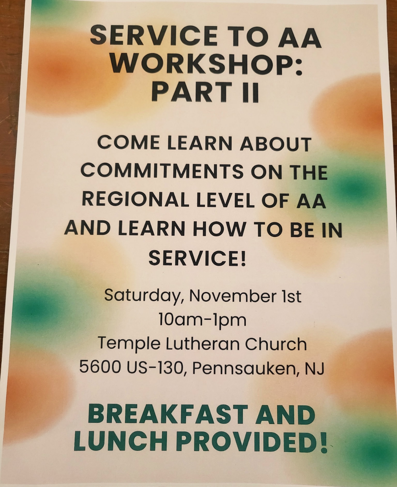 What do you know about A.A.'s Three Legacies of Recovery, Unity, and Service? Attend this FREE Workshop to learn more! NEED MORE INFO? Call 609-467-8183 d15.dcm.snjaa@gmail.com
